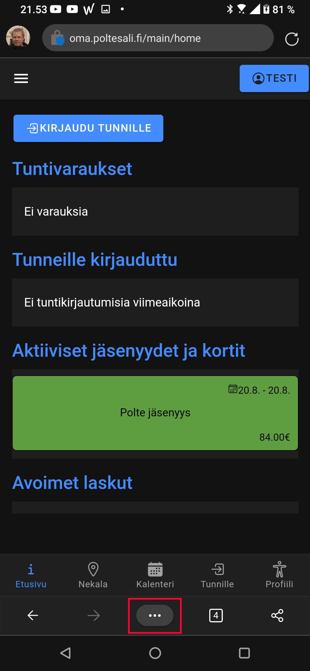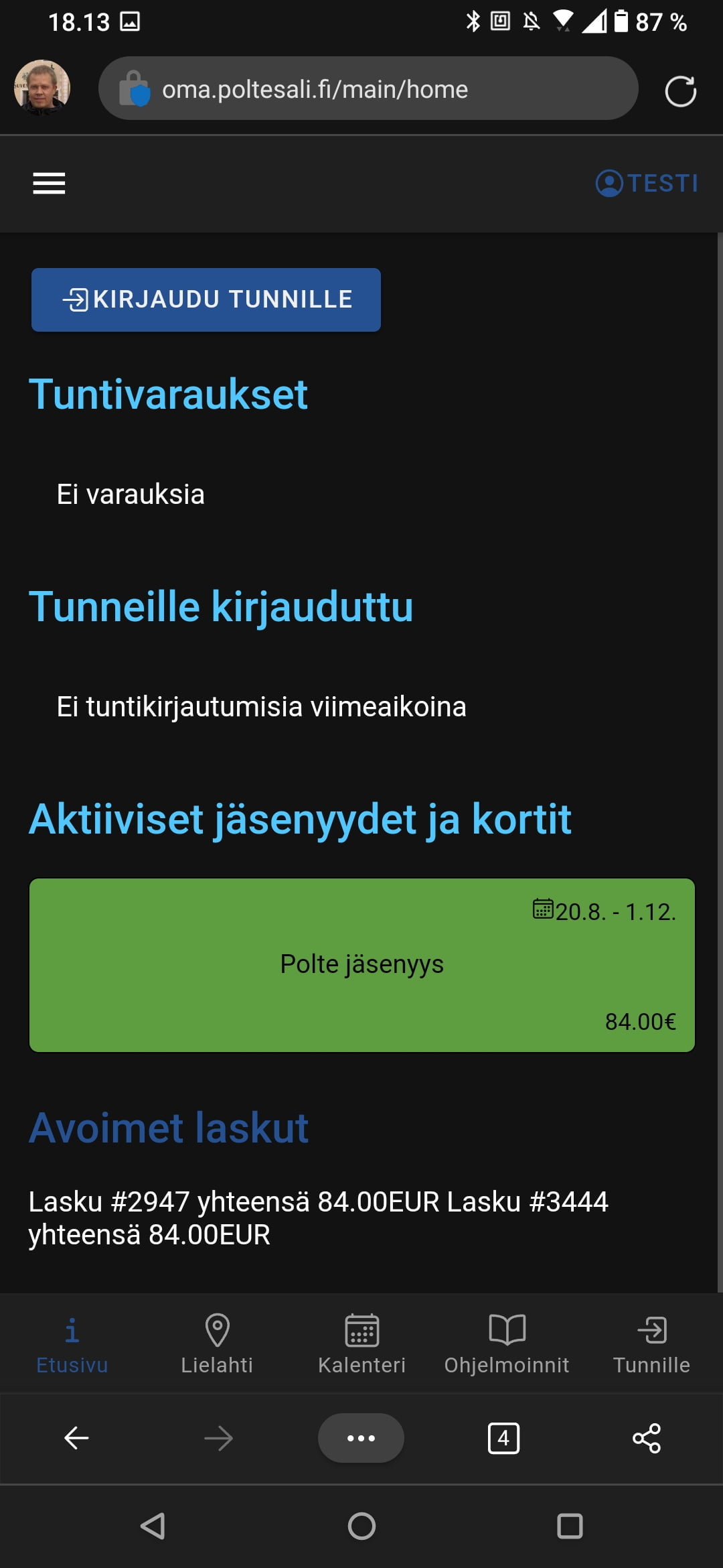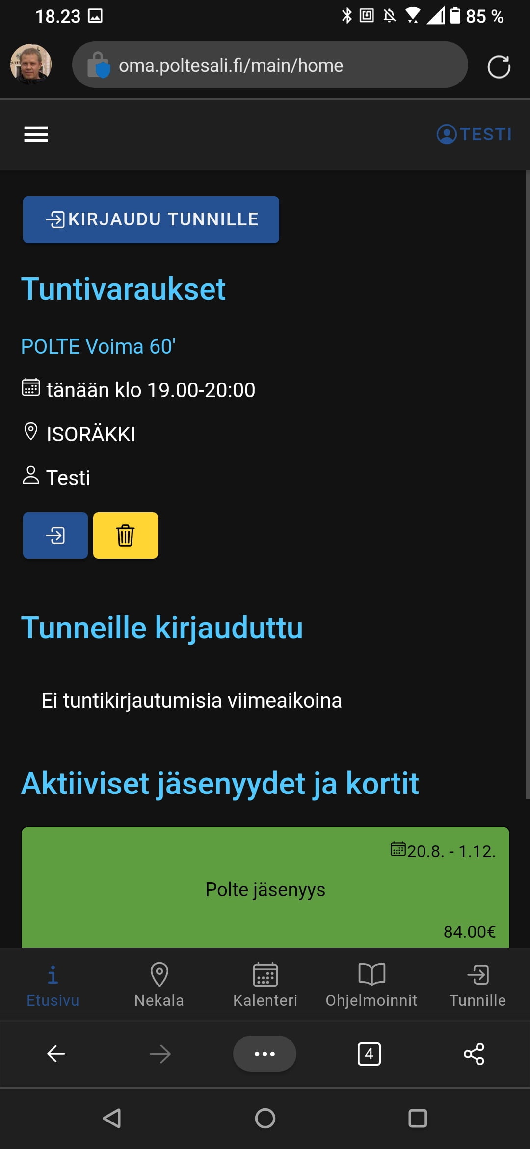 Etusivulla näkyy voimassa olevat varaukset, aiemmat tunneille kirjautumiset ja aktiiviset jäsenyydet ja kortit. Etusivulla on myös painike KIRJAUDU TUNNILLE, josta voit helposti kirjautua varatulle tunnille tai omatoimiharjoitteluun salille.