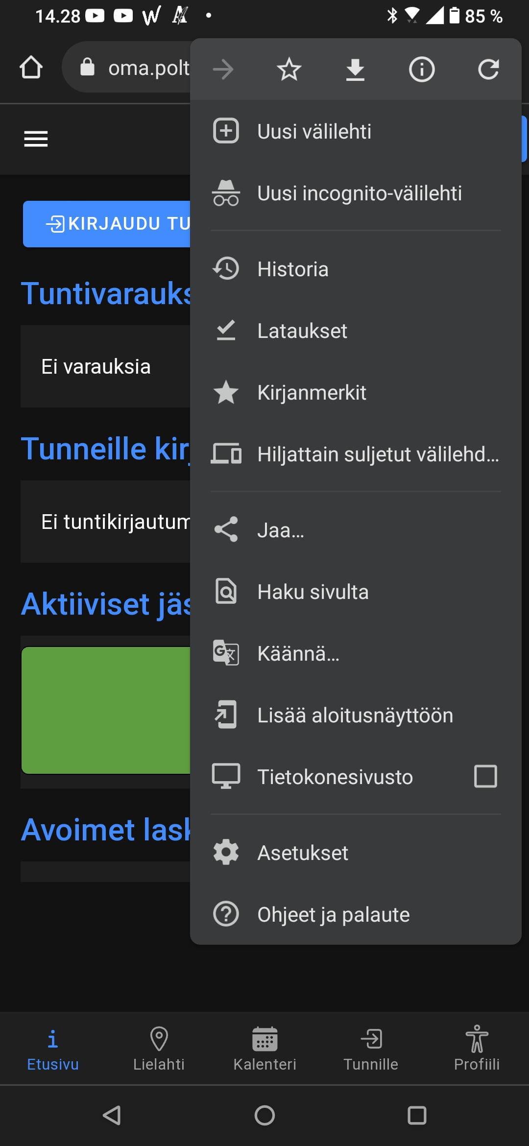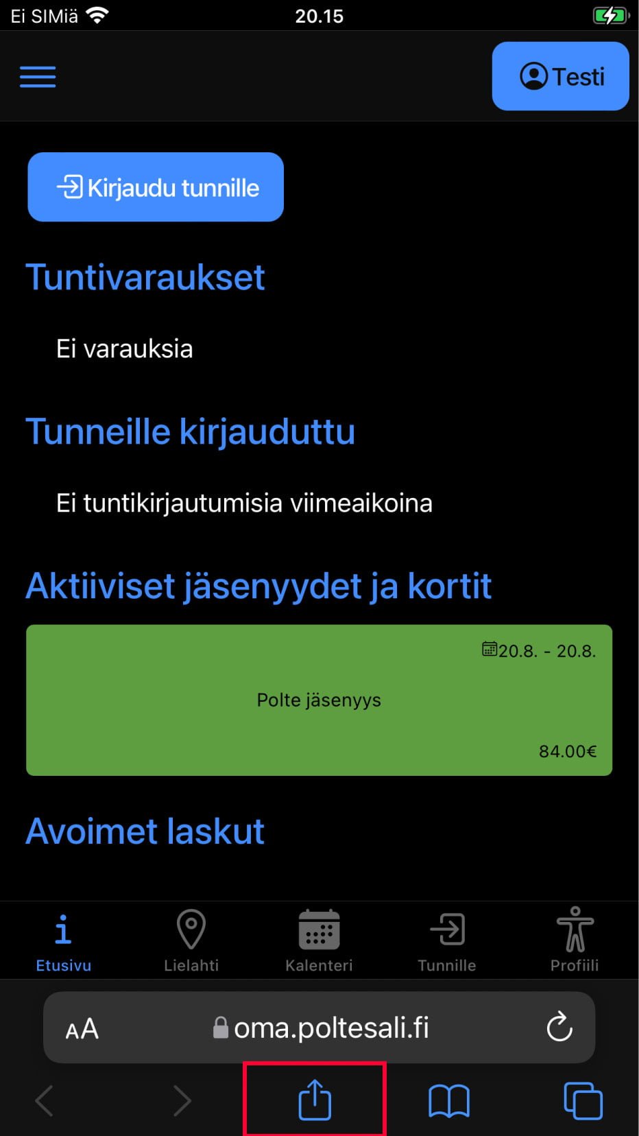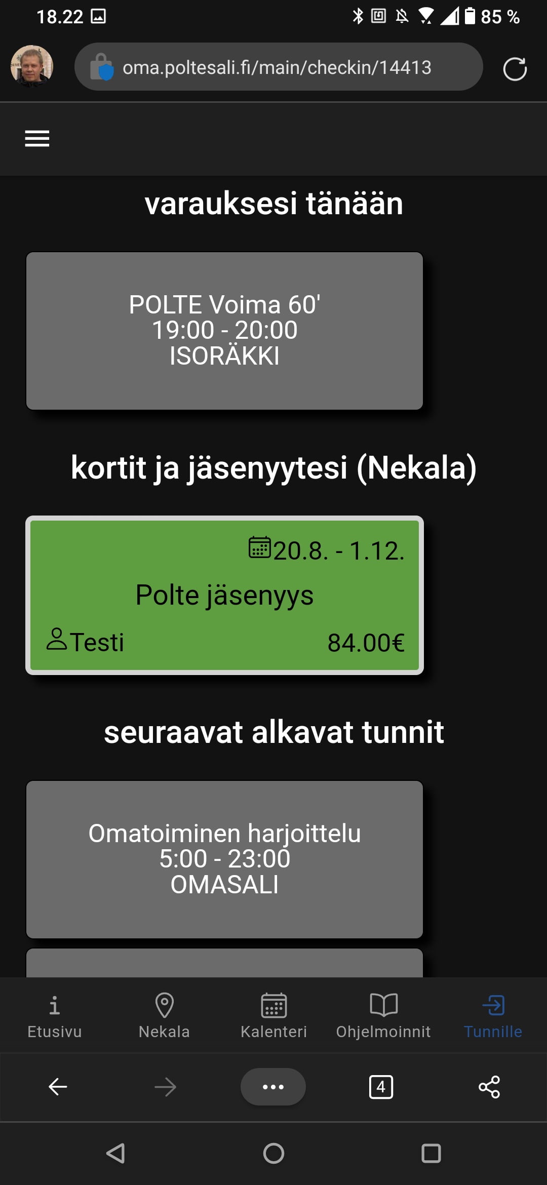 Etusivulla näkyy voimassa olevat varaukset, aiemmat tunneille kirjautumiset ja aktiiviset jäsenyydet ja kortit. Etusivulla on myös painike KIRJAUDU TUNNILLE, josta voit helposti kirjautua varatulle tunnille tai omatoimiharjoitteluun salille.