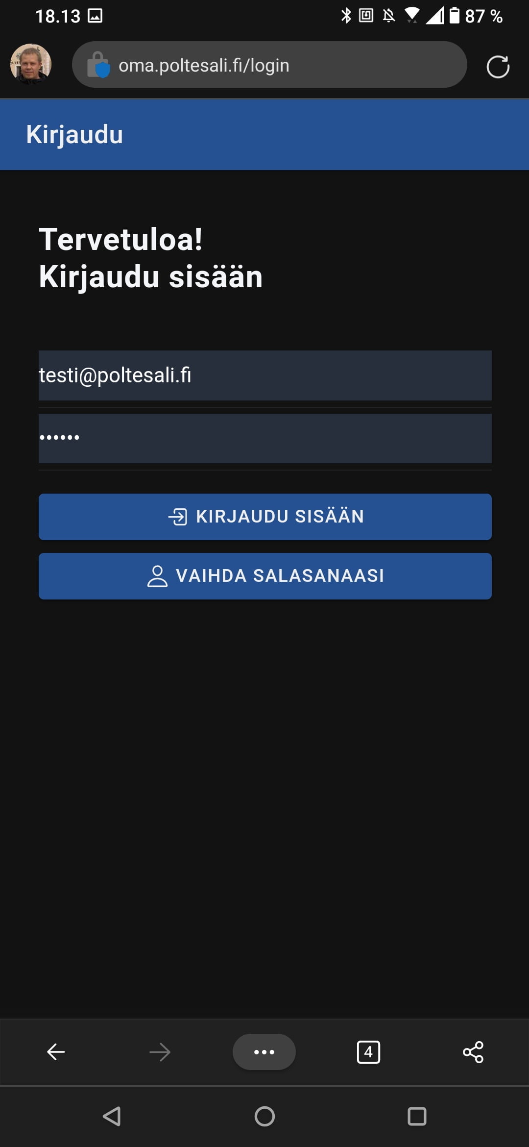 Mene osoitteeseen oma.poltesali.fi millä tahansa selailmella (PC, Mac, Android, iPhone). Klikkaa painiketta VAIHDA SALASANAASI.