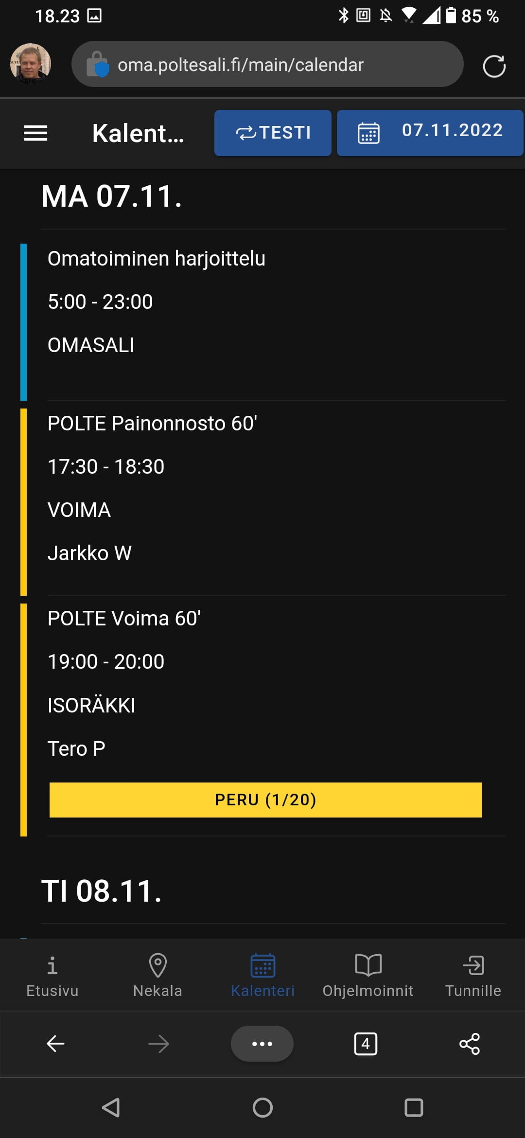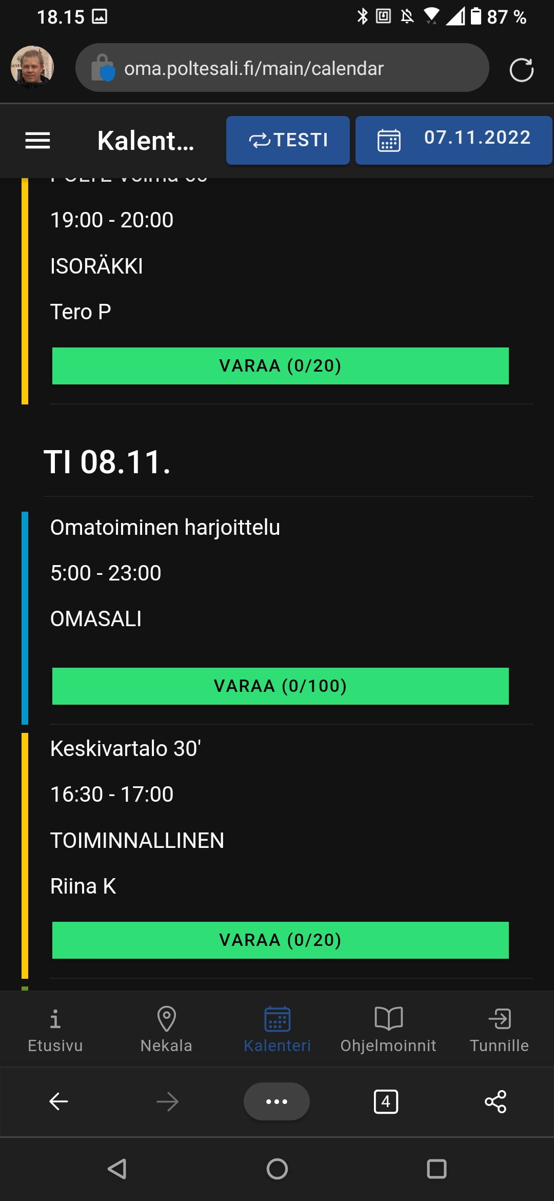 Kalenterisivun yläreunassa voit valita päivän, josta eteenpäin näet varattavat tunnit. Riveillä on varattavan tunnin nimi, kellonaika ja sijainti, jossa tunti pidetään ja ohjaaja. Vihreää VARAA painiketta painamalla voit tehdä varauksen haluamallesi tunnille. VARAA sanan perässsä on suluissa (varaukset / varattavien paikkojen) määrät. Vasemmalla oleva viivan väri kertoo vaativuustason.