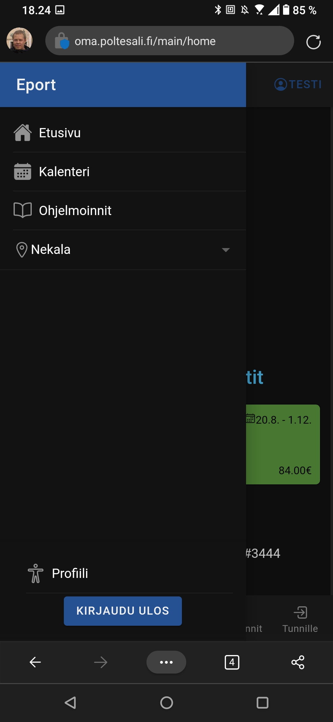 Sivuvalikossa (3 viivaa tai pistettä) löytyy alavalikkovaihtoehtojen lisäksi Profiili valikko ja KIRJAUDU ULOS painike.