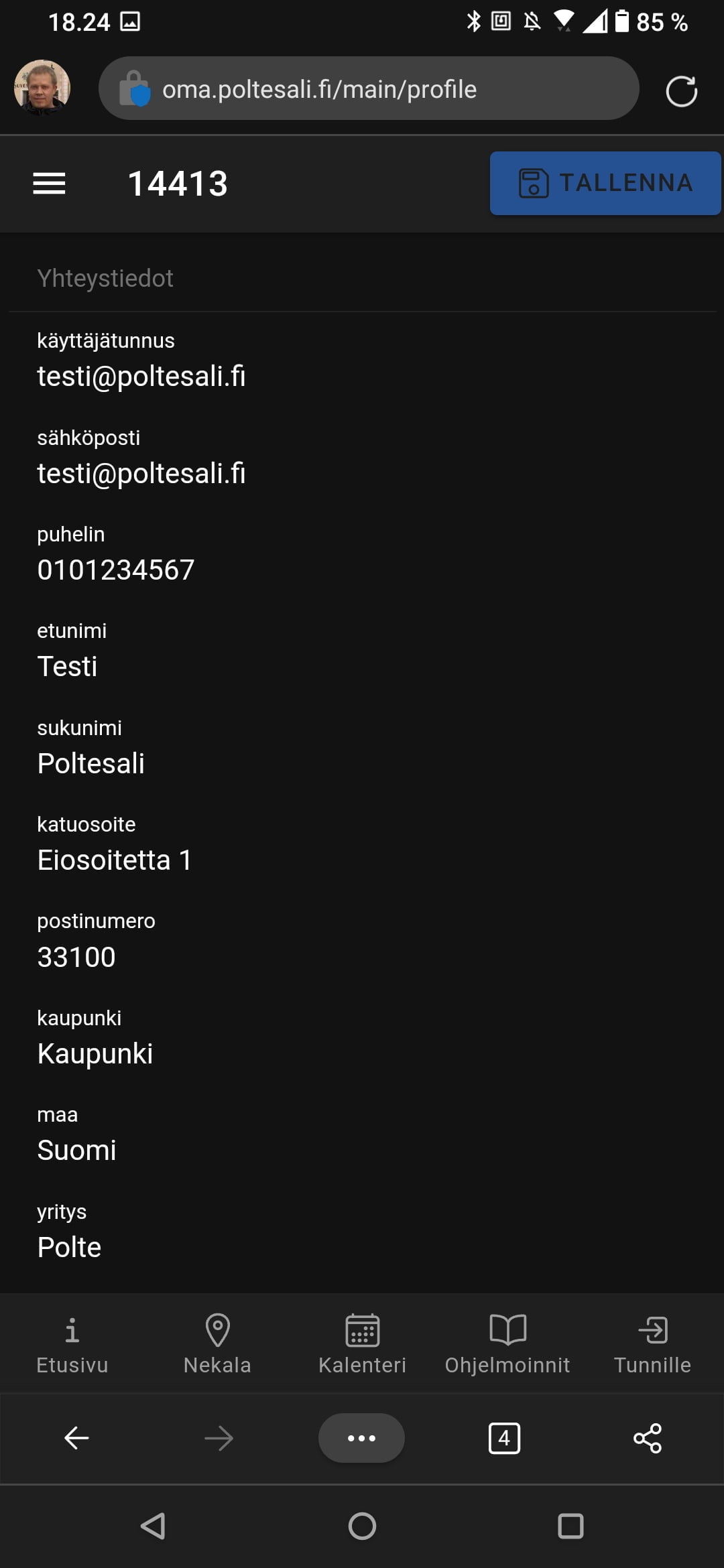 Profiilisivulta näet järjestelmässä olevat tietosi ja voit myös päivittää muuttuneet tietosi. Jos teet muutoksia, niin muista painaa yläreunassa olevaa sinistä TALLENNA painiketta. Vasemmalla yläkulmassa oleva viisinumeroinen numero on asiakasnumerosi. Tarkistathan ensimmäisellä kerralla, että tietosi ovat ajantasalla!