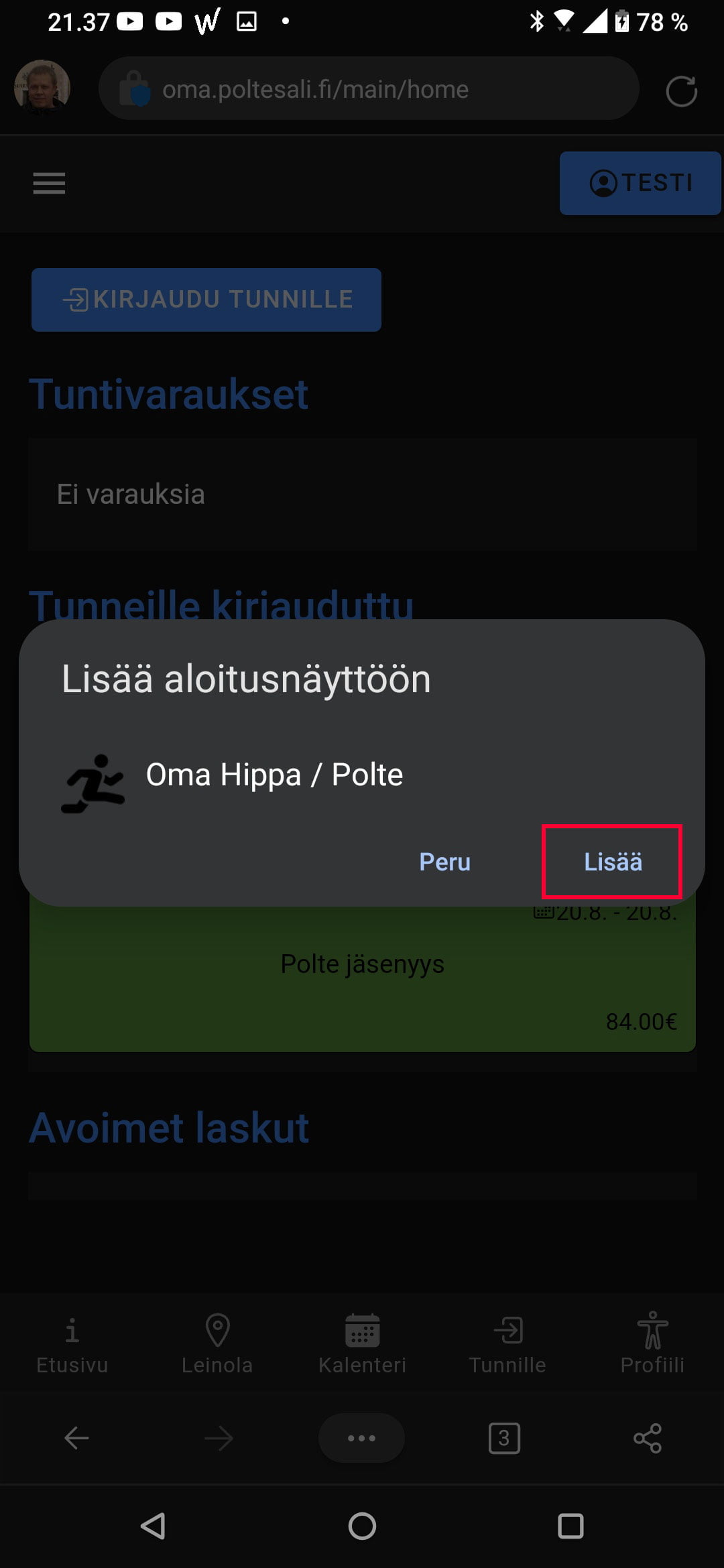 Klikkaa Lisää painiketta.  Oma Hippa / Polte kuvake ilmestyy puhelimen aloitusnäytölle vapaaseen kohtaan. Tässä näytössä voit halutessasi muuttaa kuvakkeen alla olevaa tekstiä. Voit esimerkiksi ottaa Hippa sanan pois jolloin kuvakkeen tekstiksi tulee Oma Polte.