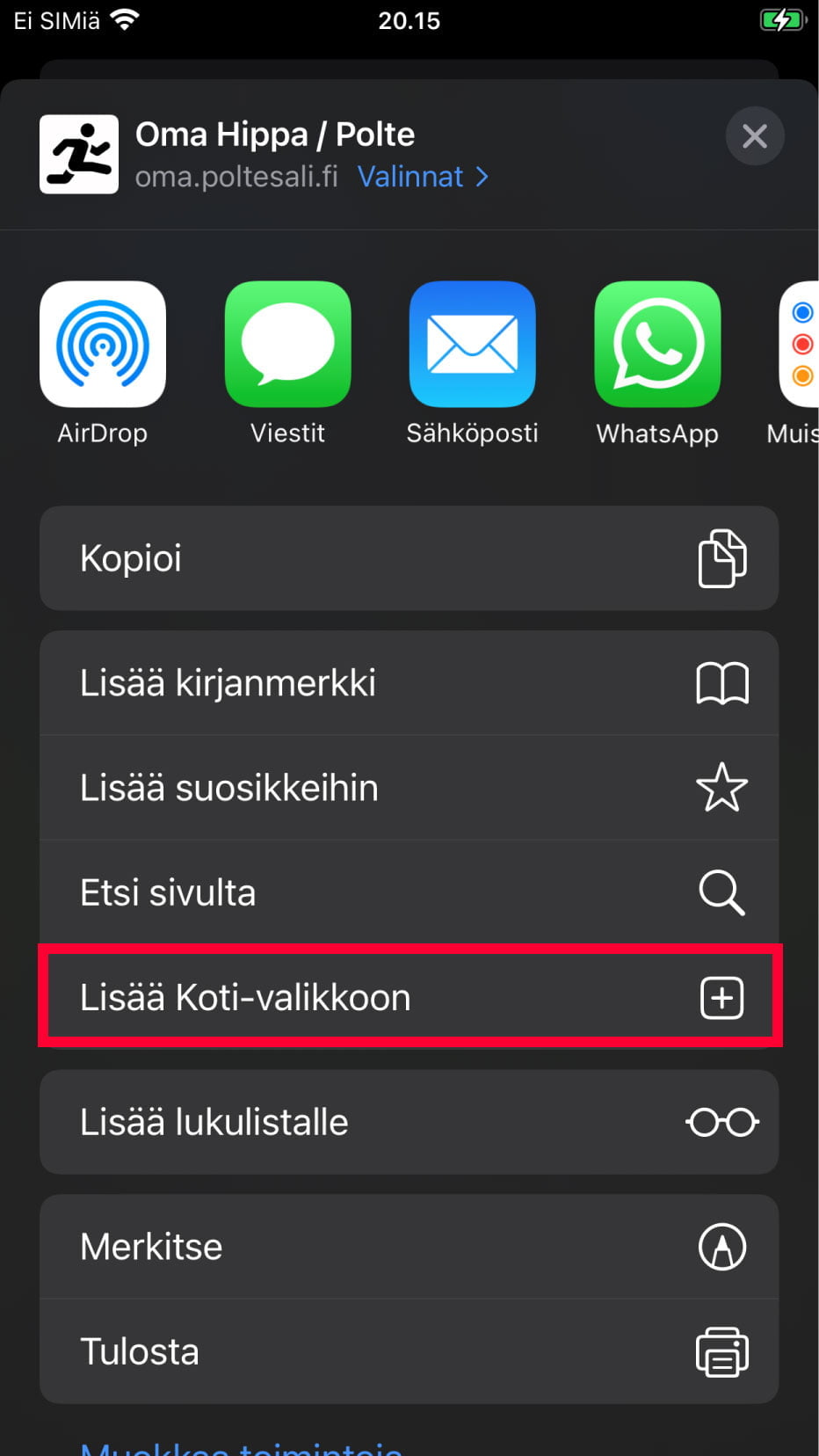 Voit lisätä Oma Hippa / Polte (Eport) kuvakkeen puhelimesi aloitusnäytölle, jolloin pääset nopeasti avaamaan ohjelman. Seuraavassa on ohjeet yleisimille puhelimien selaimille (Microsoft Edge, Google Chrome, iOS Safari).