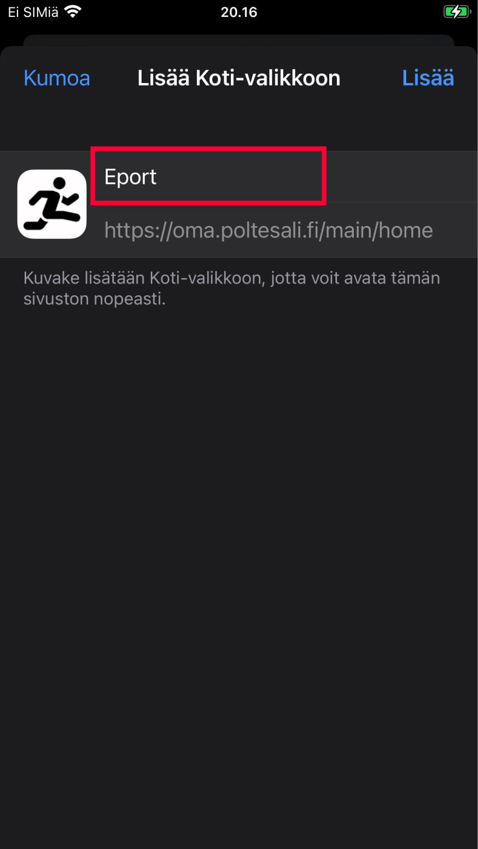 Klikkaa Lisää kohtaa oikeassa yläkulmassa. Voit halutessasi tässä kohtaa muuttaa kuvakkeen tekstiä esimerkiksi Eport -> Oma Polte. Kuvake ilmestyy puhelimen aloitusnäyttöön, josta on helppo avata Eport.